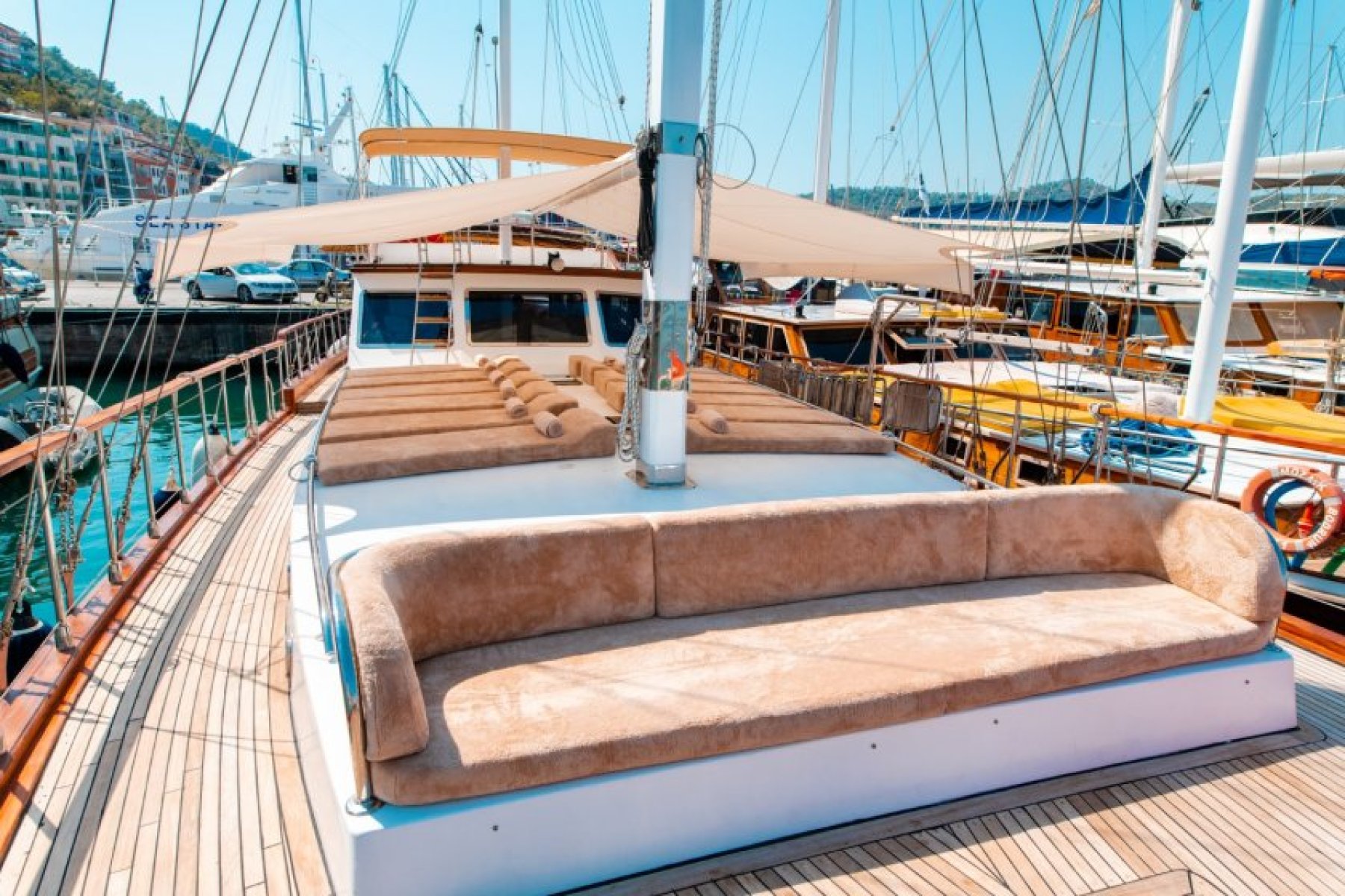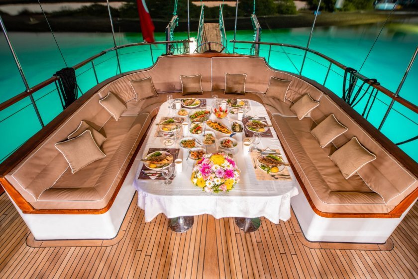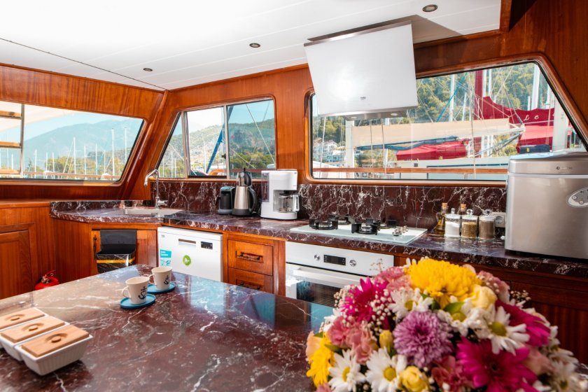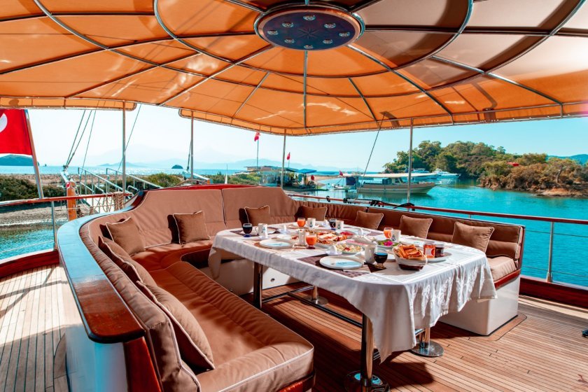 The yacht features large deck areas for sunbathing and outdoor dining in the serene bays of Gocek. For adventure seekers, the boat provides water sports equipment such as a canoe, ringo, and banana boat. These amenities turn a relaxing cruise into an engaging sailing holiday experience. The spacious interior salon also offers a comfortable area for social gatherings or quiet relaxation away from the sun.