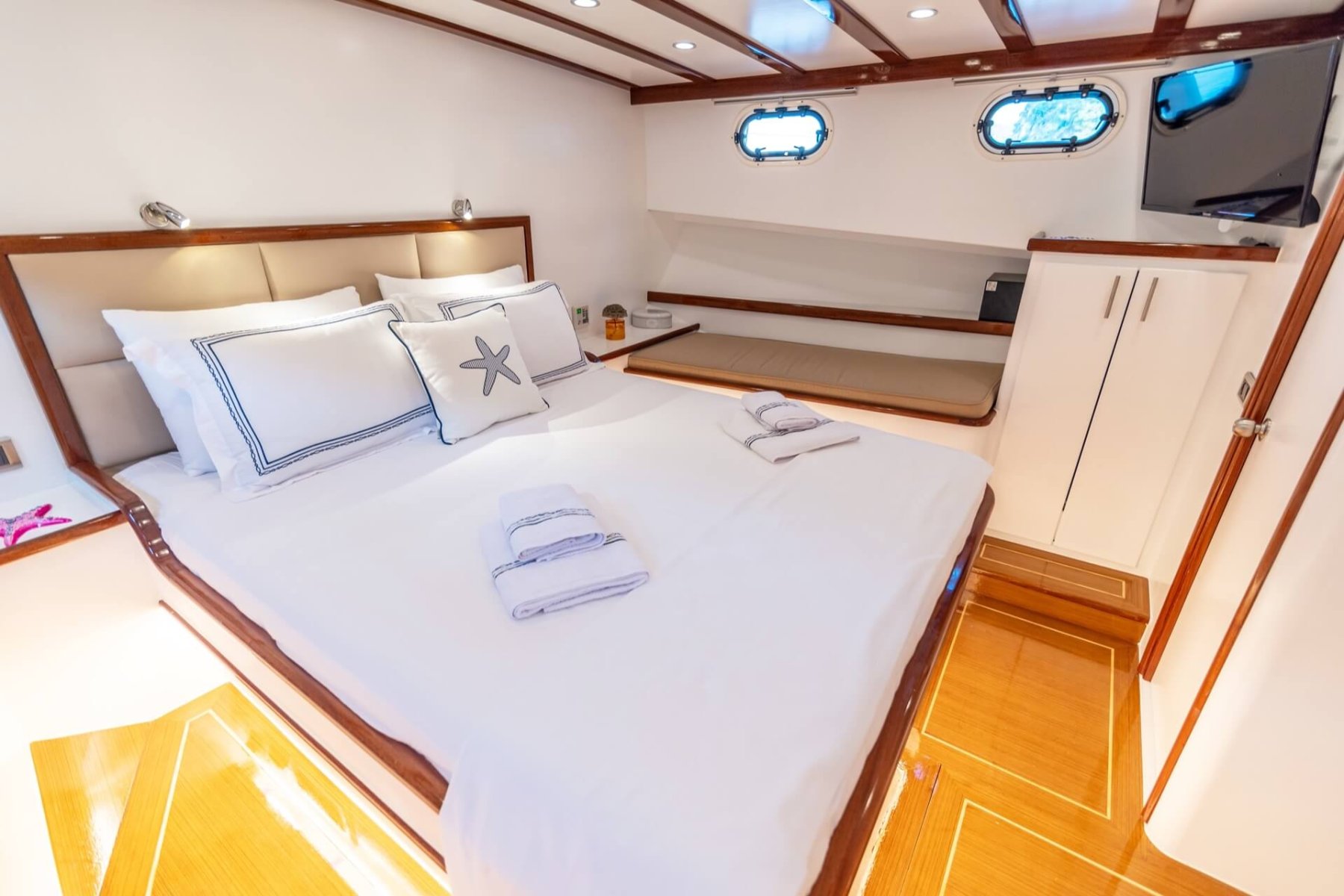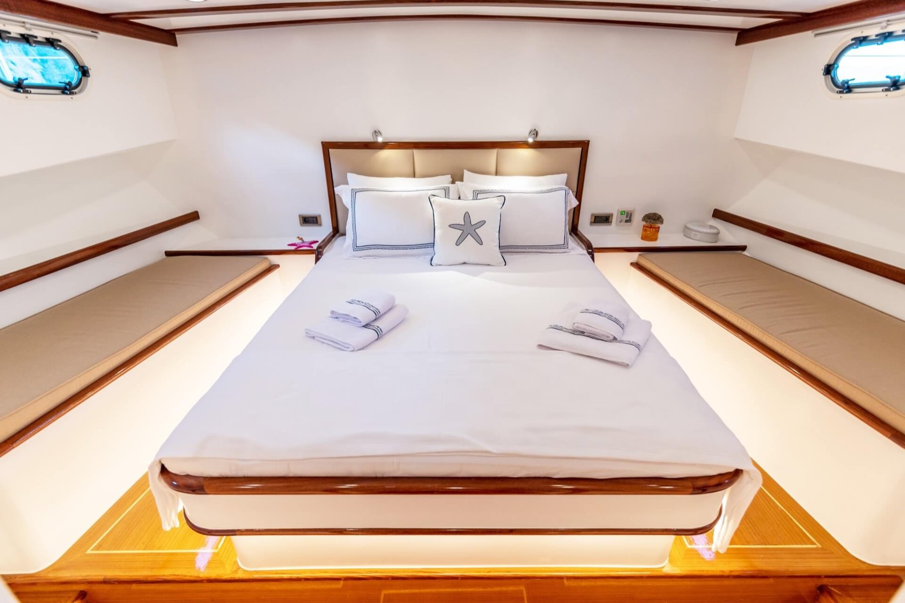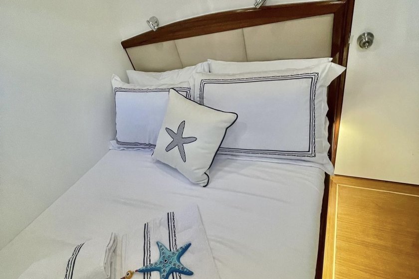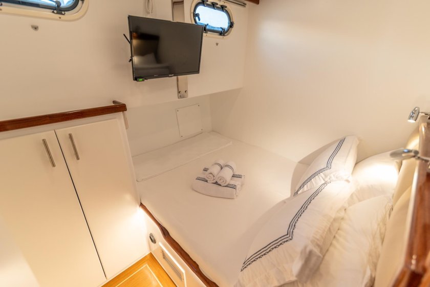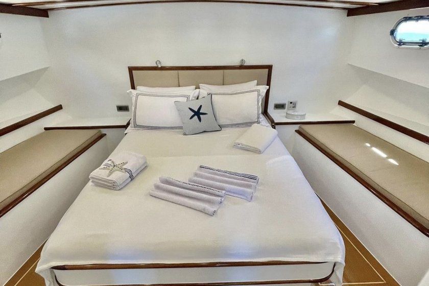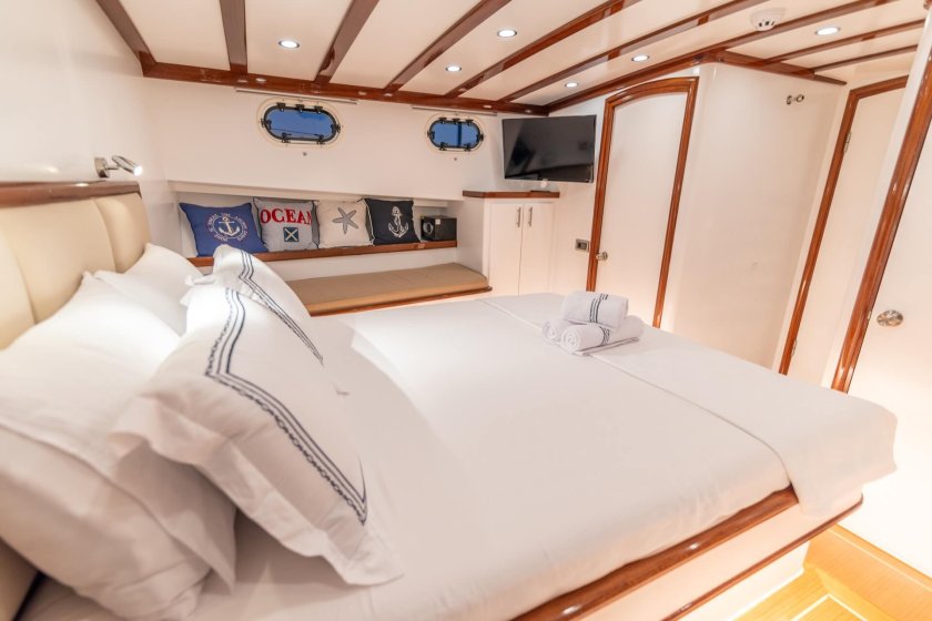 The yacht features one master suite and two double cabins, each meticulously designed to prioritize guest relaxation. As a standout choice for those seeking climate controlled comfort, the Bernis provides 4 to 6 hours of air conditioning during the day, with optional overnight use available. For sailing enthusiasts, the recently upgraded Genoa sail system adds a touch of traditional maritime adventure to your journey.