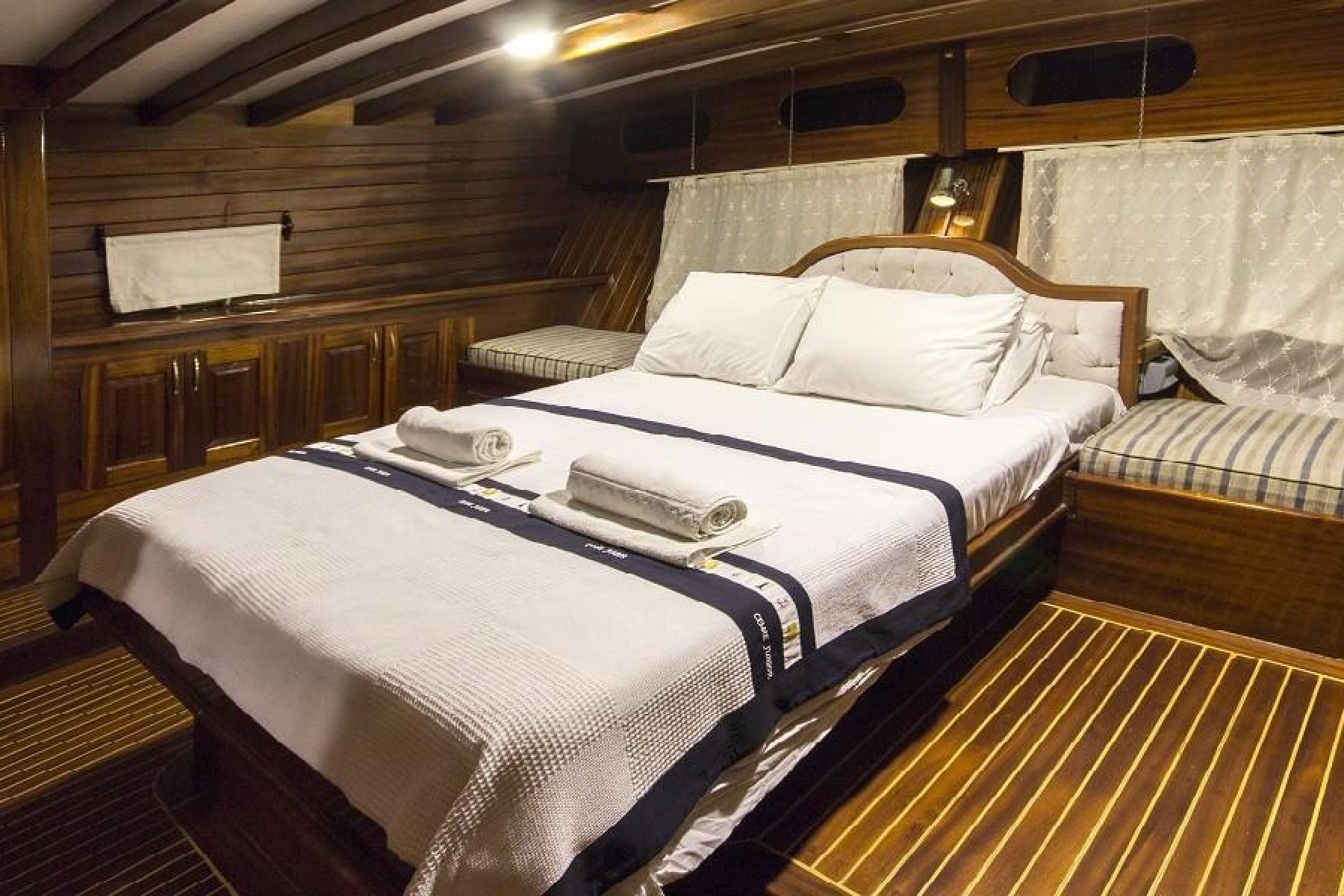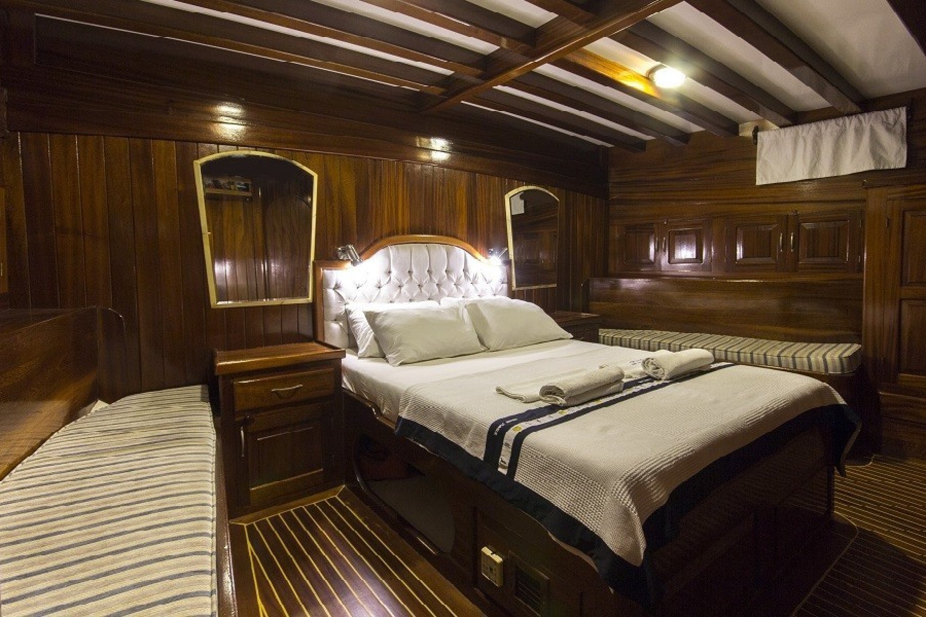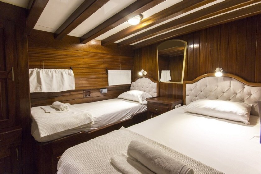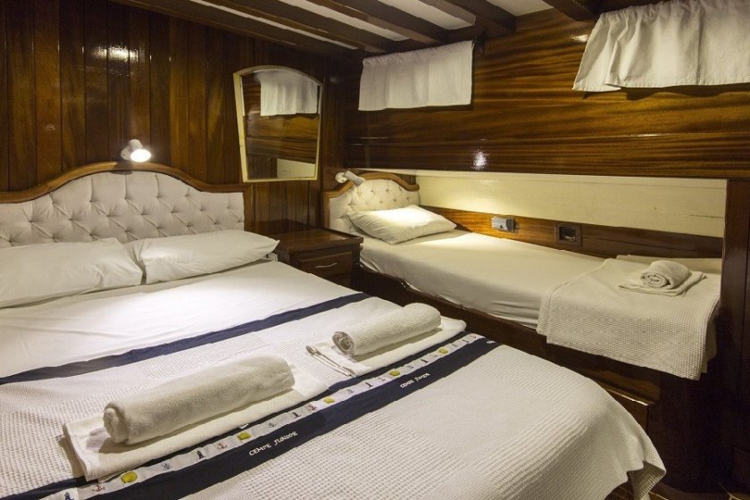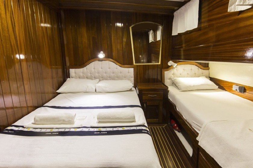 The yacht features a unique 6 cabin layout, consisting of 2 master and 4 triple cabins, making it an ideal choice for families or mixed groups of up to 12 guests. Each cabin is fully self-contained with a private shower, toilet, and air conditioning. Beyond the cabins, the boat boasts a bright, airy salon and expansive deck areas designed for sunbathing and alfresco dining under the stars.