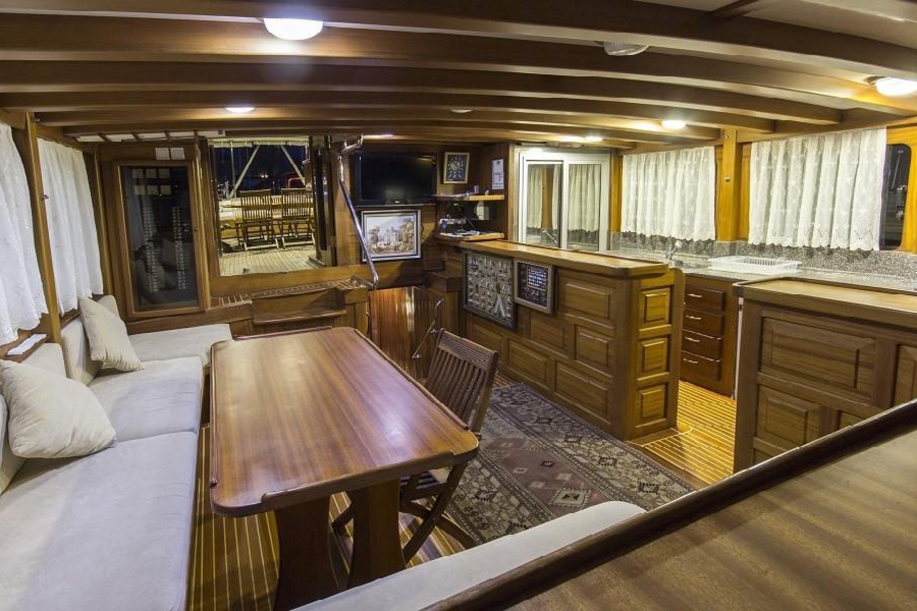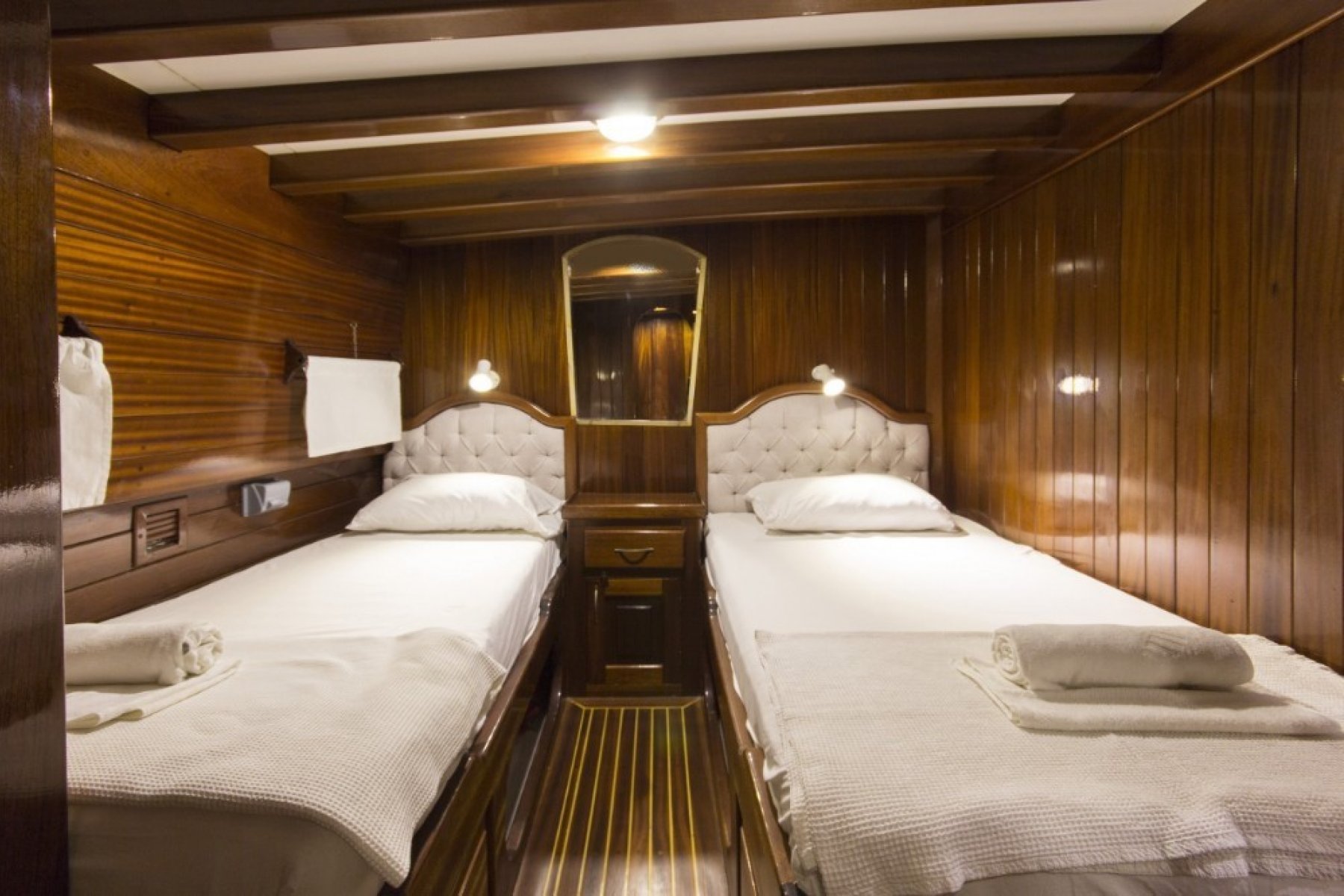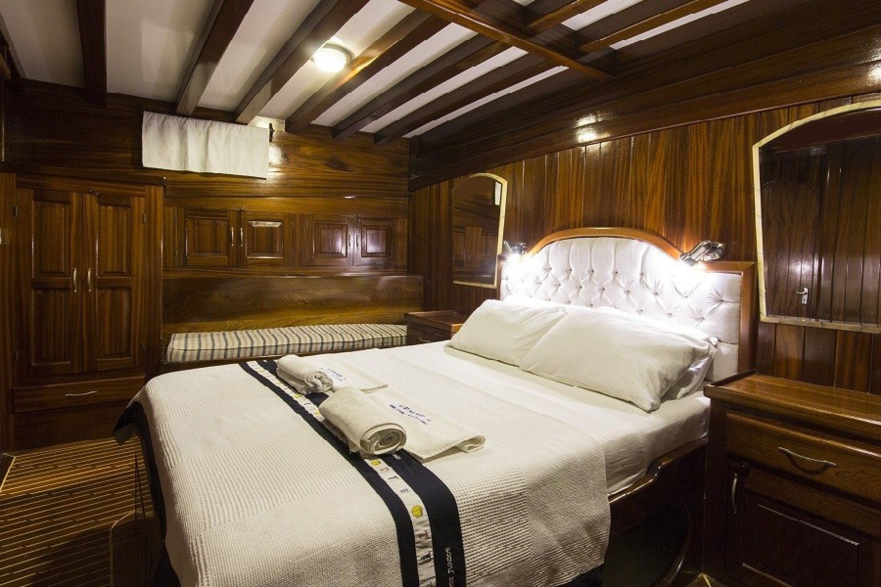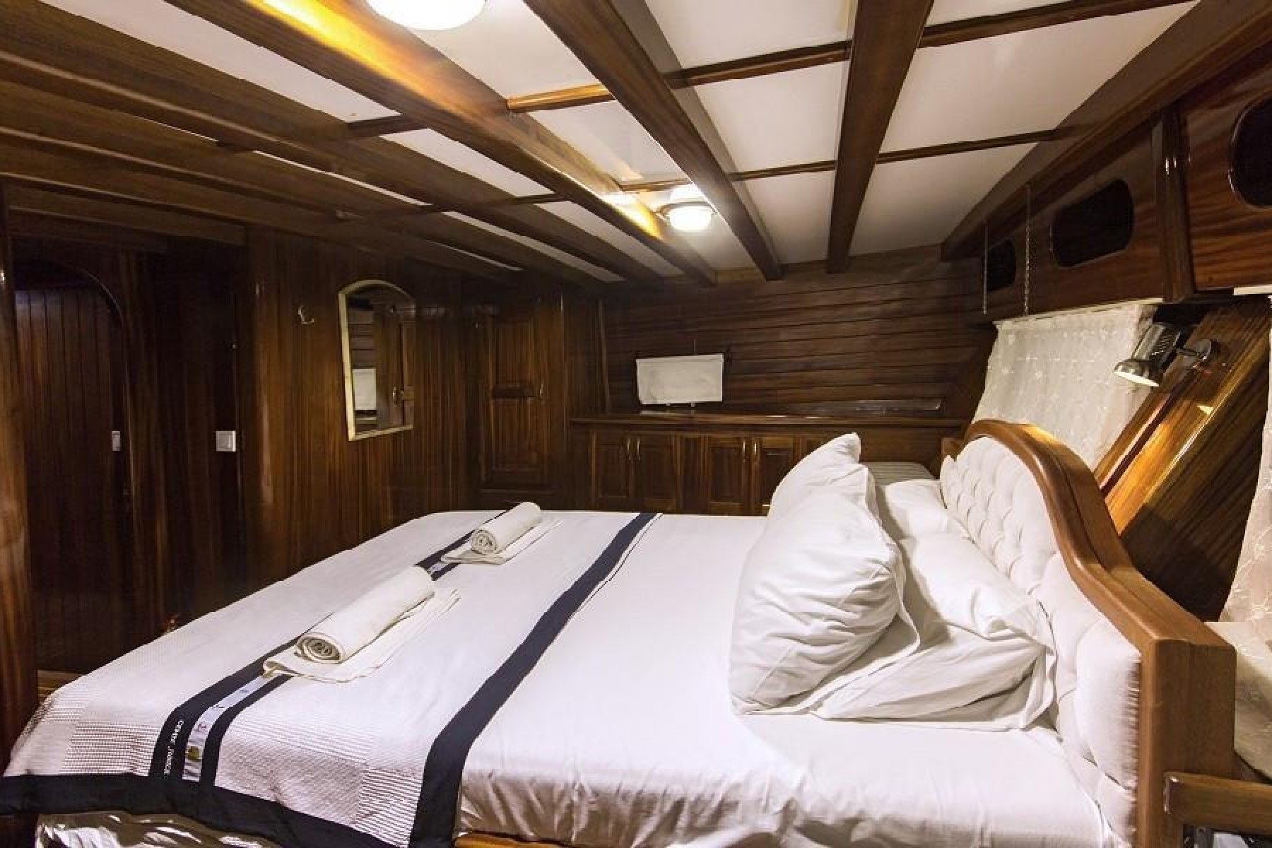 The yacht features a unique 6 cabin layout, consisting of 2 master and 4 triple cabins, making it an ideal choice for families or mixed groups of up to 12 guests. Each cabin is fully self-contained with a private shower, toilet, and air conditioning. Beyond the cabins, the boat boasts a bright, airy salon and expansive deck areas designed for sunbathing and alfresco dining under the stars.