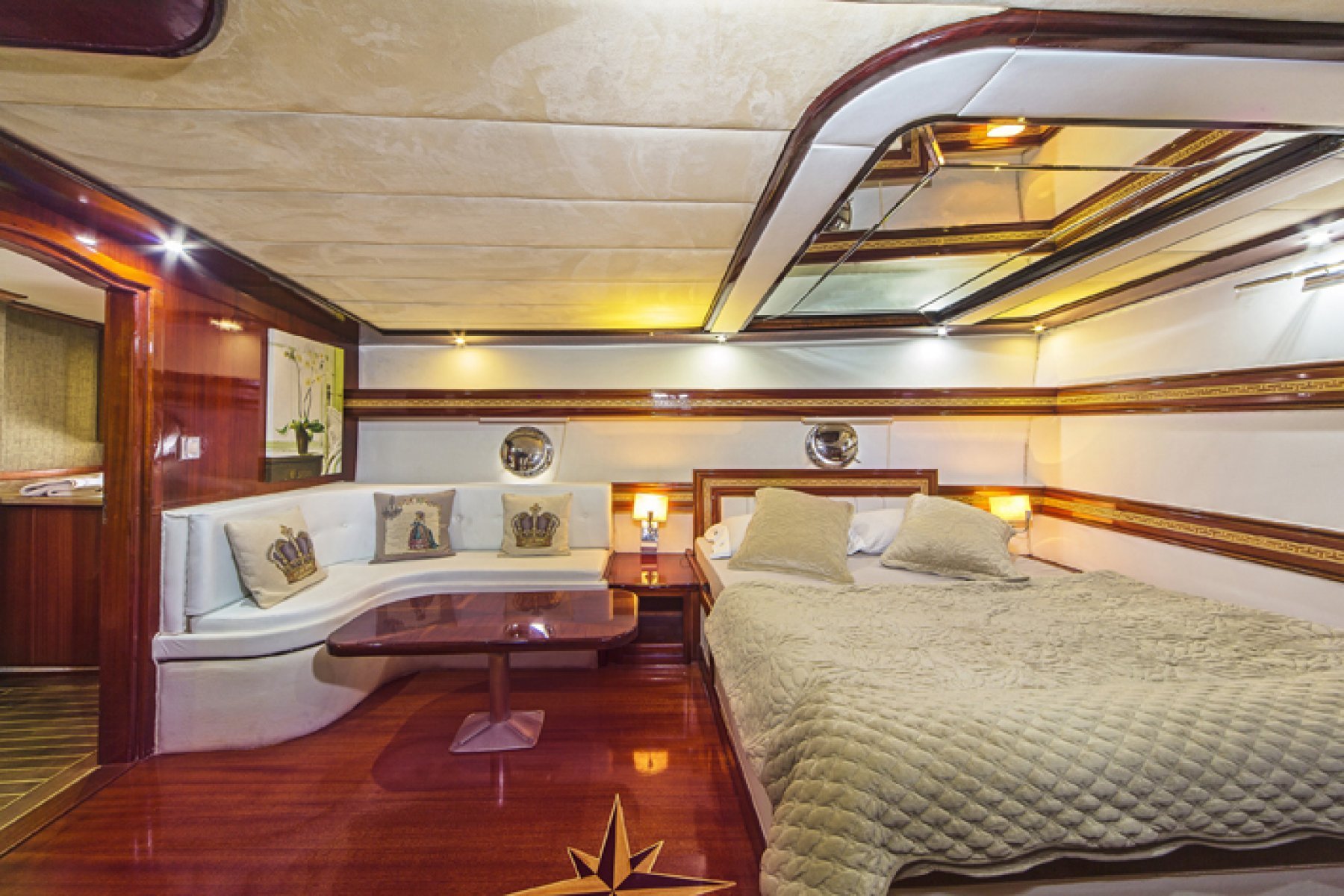 With a 6 cabin layout featuring 2 Master, 3 Double, and 1 Twin, the boat comfortably hosts up to 12 guests. Each cabin prioritizes privacy and luxury, equipped with en suite bathrooms, LED TVs, air conditioning, and Wi Fi. The interior salon is elegantly decorated with light toned furniture and polished wood, providing a refined social space for dining and relaxation. This meticulous design ensures a five star experience for all families and groups.