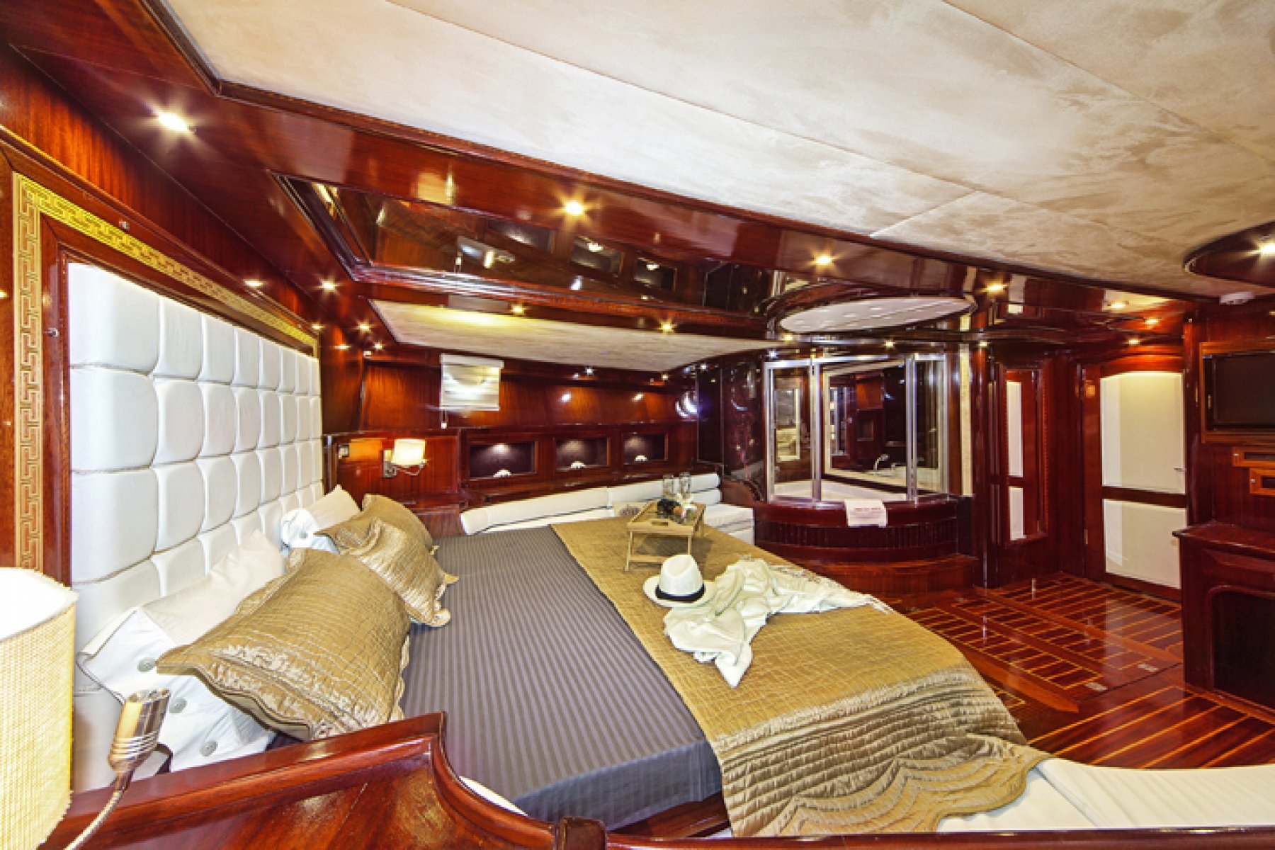 The expansive deck areas are the highlight of the Perla Del Mar 2, boasting a full length aft seating area and an outdoor bar. The foredeck features a large sunbathing section and a wide jacuzzi, offering a unique way to enjoy the Mediterranean scenery. For travelers looking for an elite luxury yacht rental, this vessel provides the perfect balance of comfort and style. Contact our sales team for special offers and to start planning your dream maritime getaway.