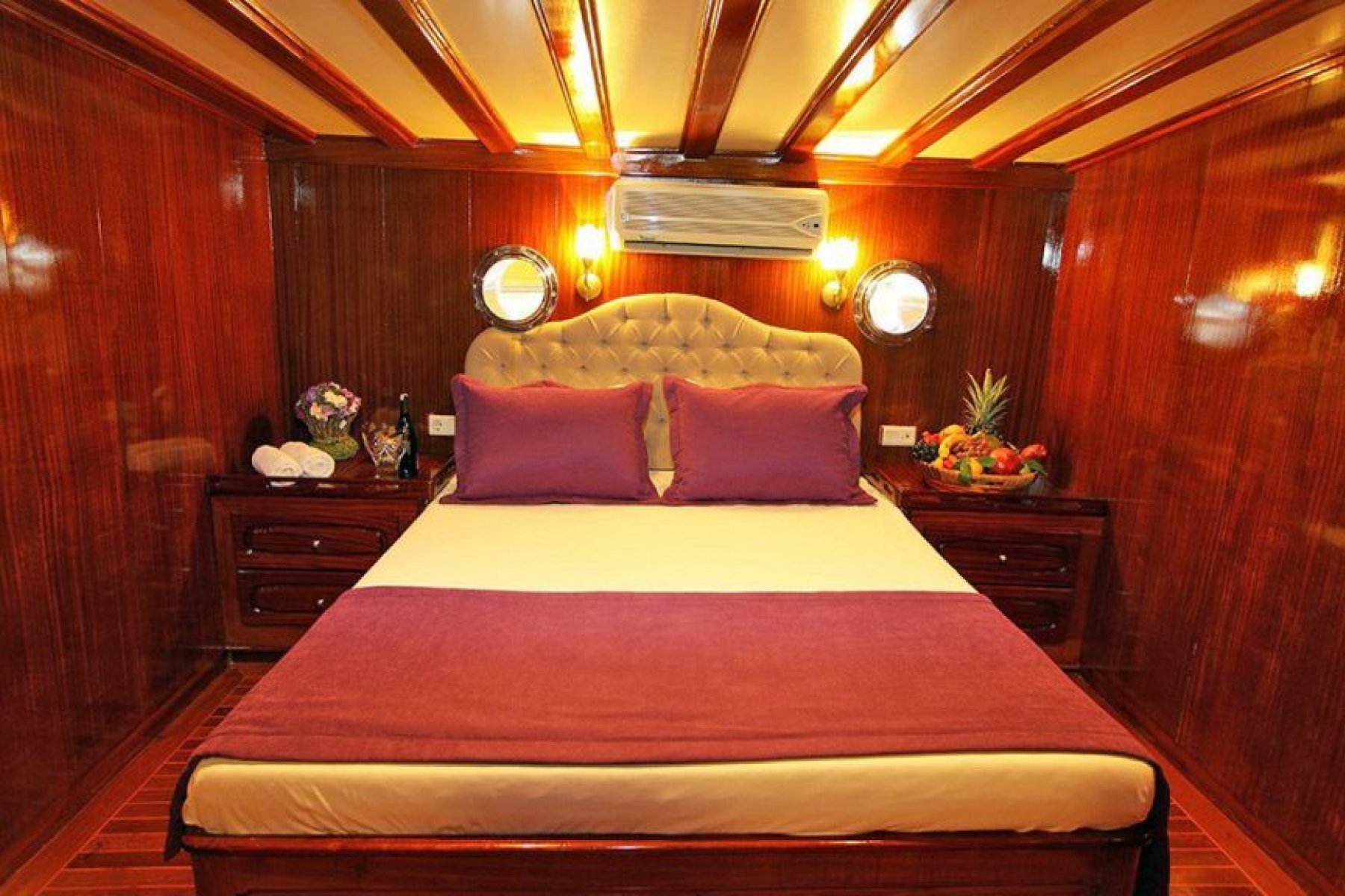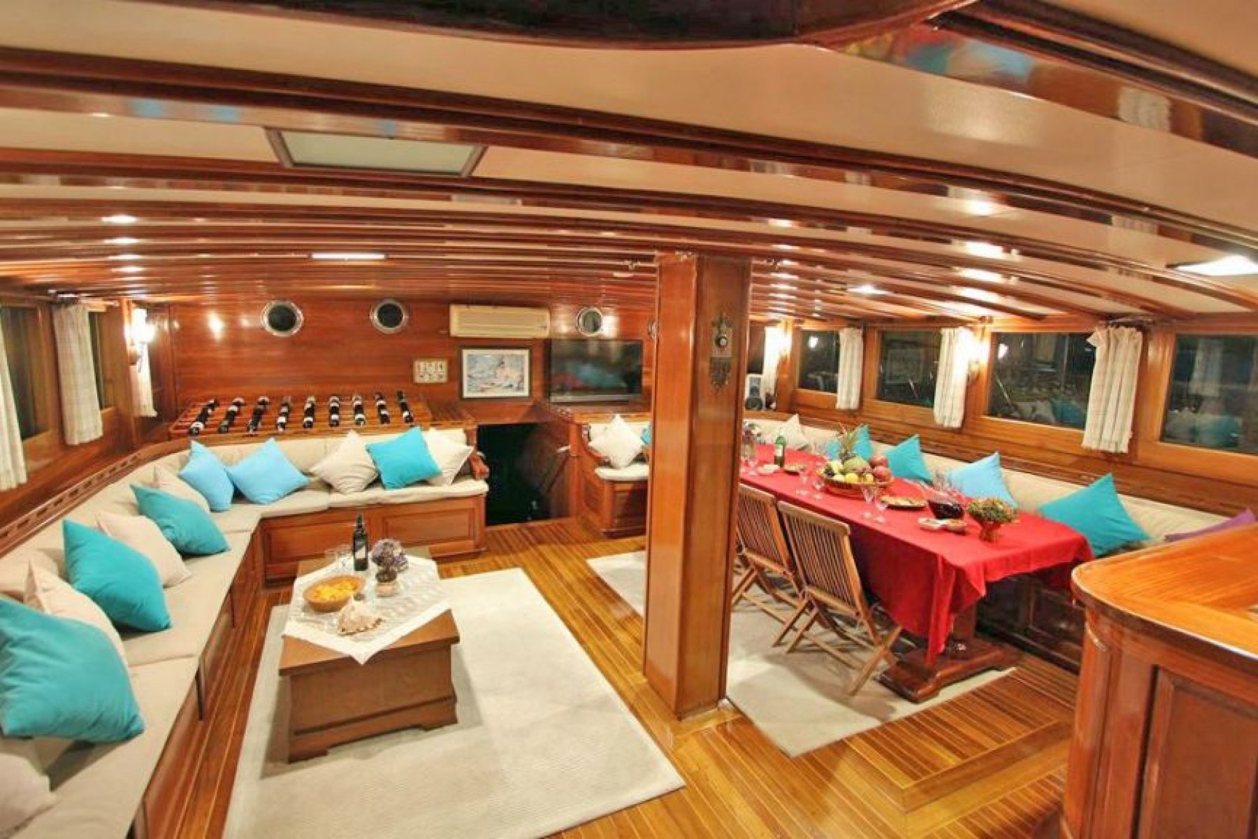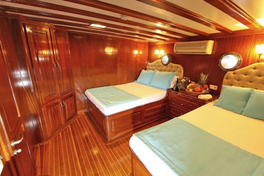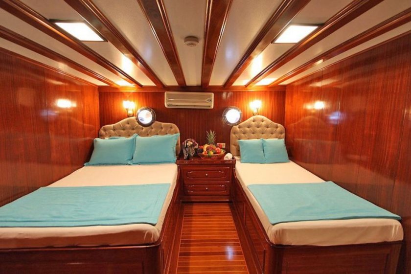 The yacht features an expansive accommodation layout consisting of six double and two triple cabins, comfortably hosting up to 18 guests. Each cabin is thoughtfully equipped with private air conditioning, a shower, and a toilet to ensure guest comfort and privacy. To maintain a pleasant atmosphere during the warm summer days, the vessel provides six to eight hours of air conditioning service daily.