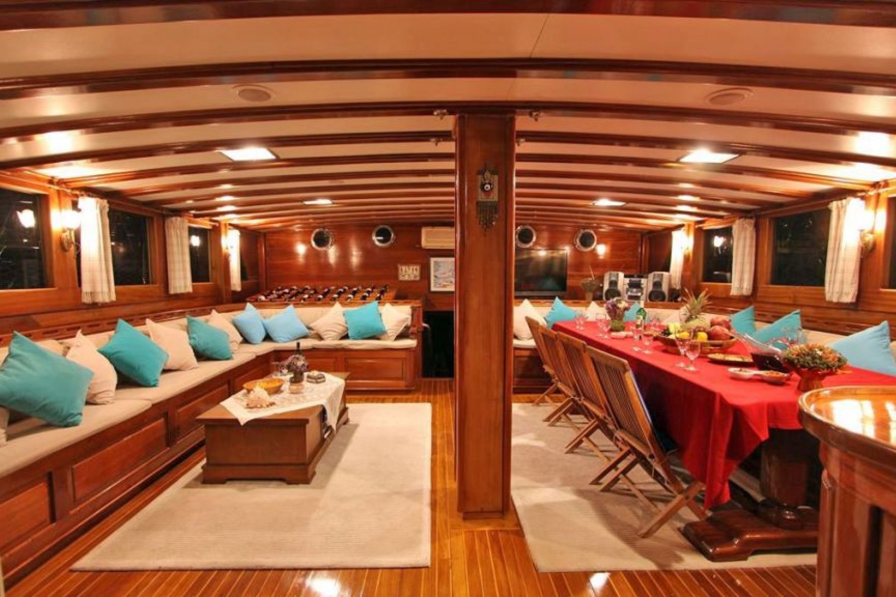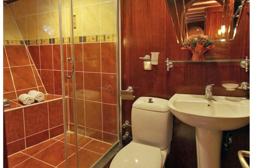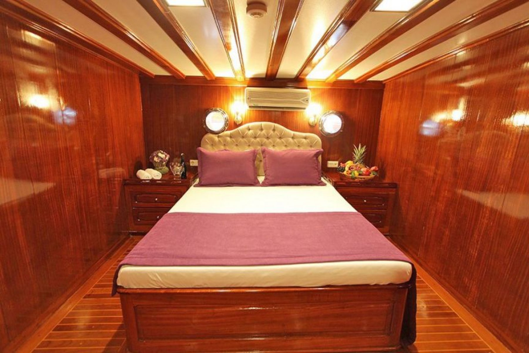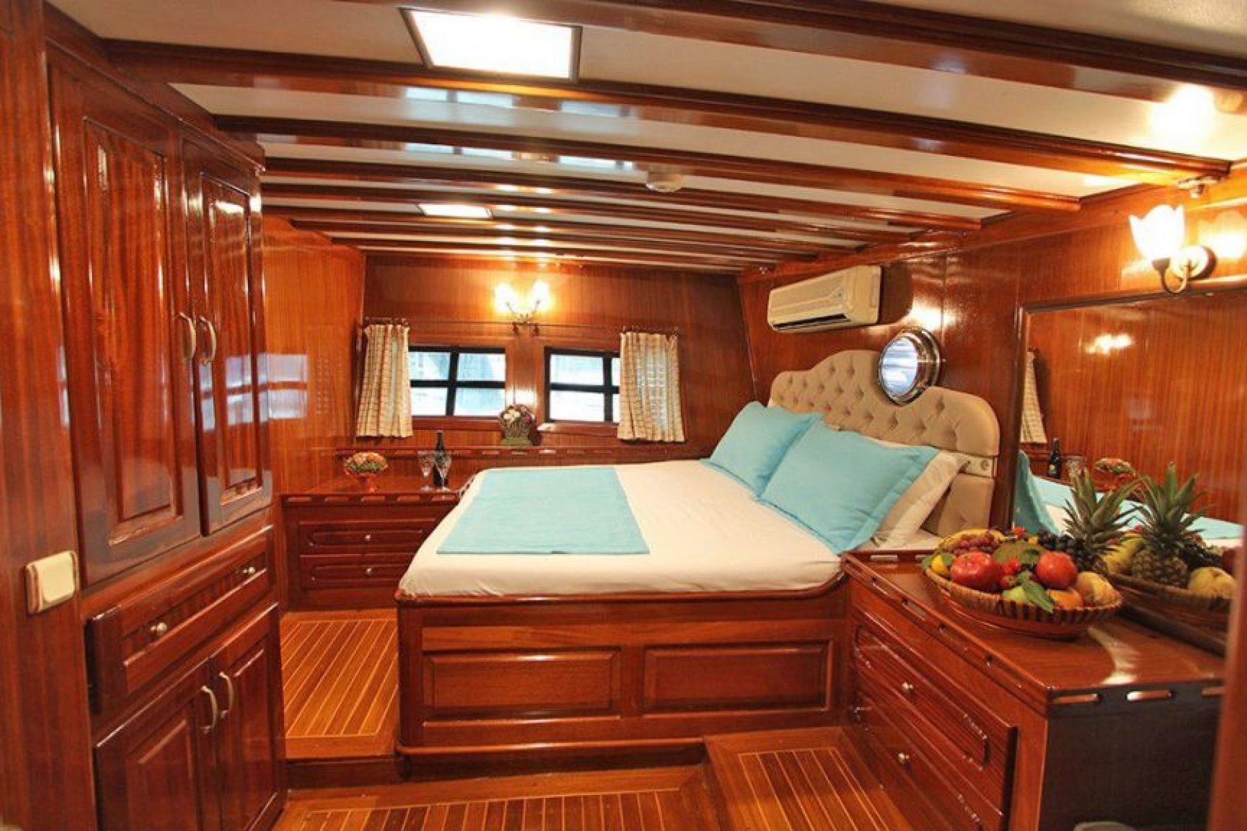 The yacht features an expansive accommodation layout consisting of six double and two triple cabins, comfortably hosting up to 18 guests. Each cabin is thoughtfully equipped with private air conditioning, a shower, and a toilet to ensure guest comfort and privacy. To maintain a pleasant atmosphere during the warm summer days, the vessel provides six to eight hours of air conditioning service daily.