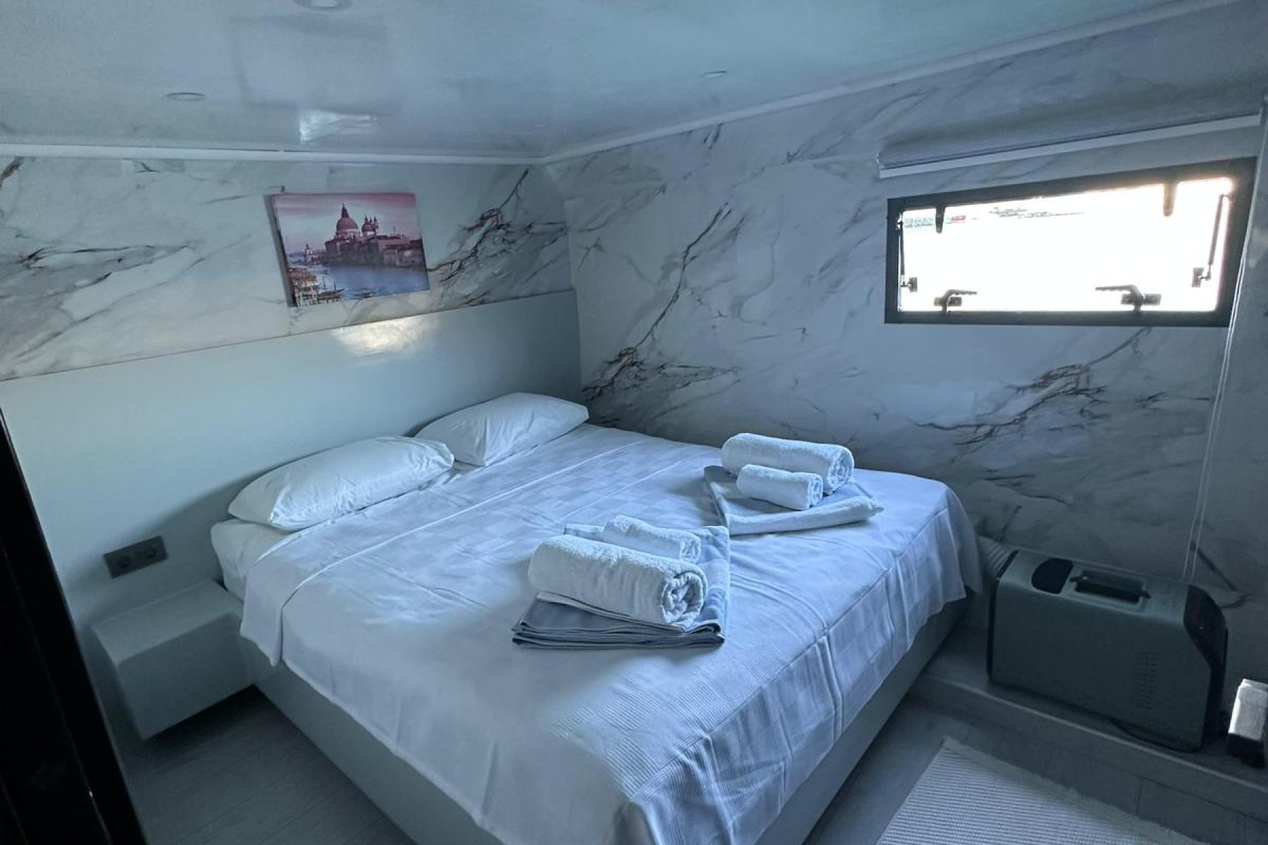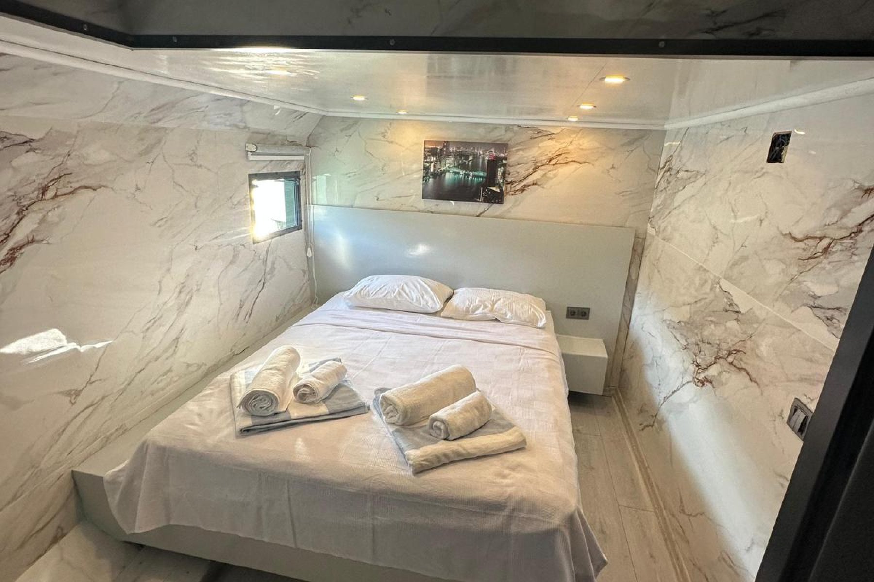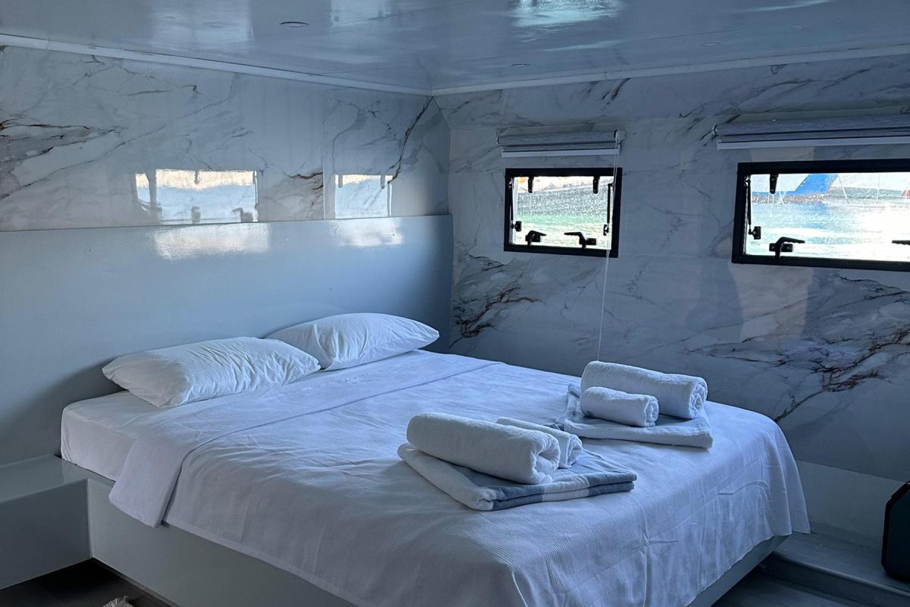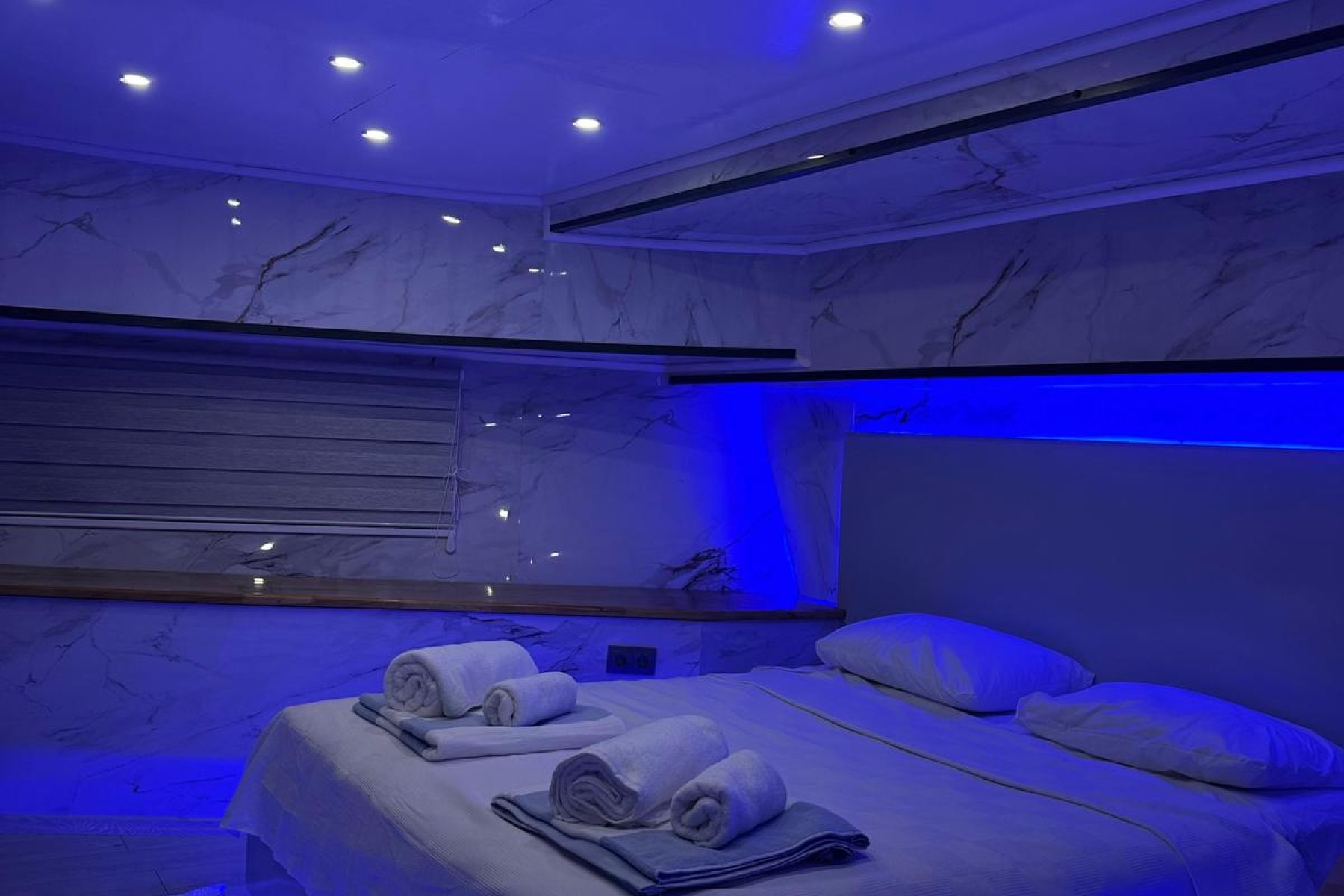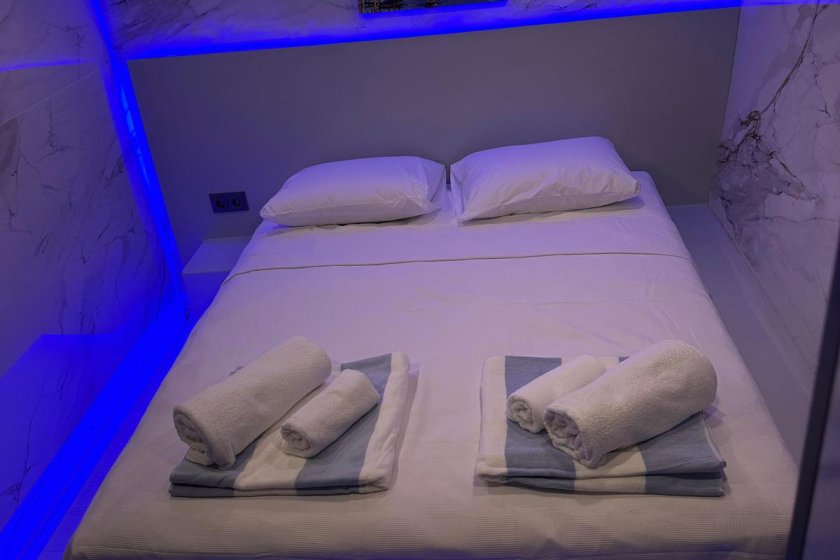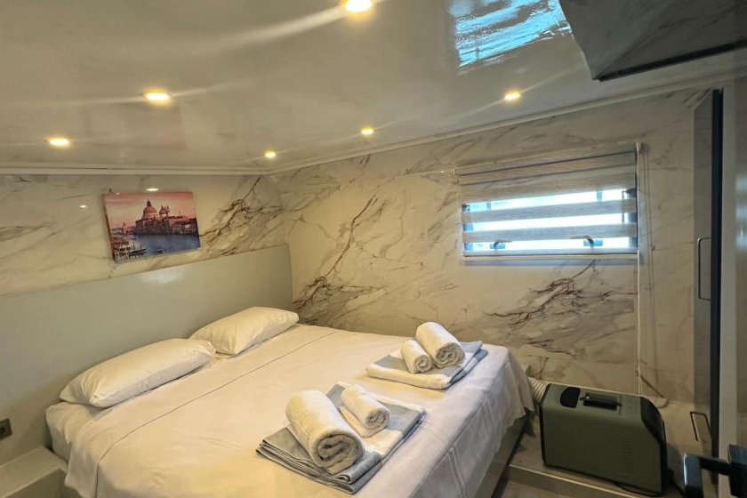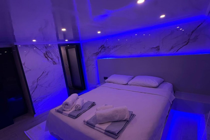 The yacht accommodates up to 8 guests in four elegant cabins, including two Master and two Double suites. Supported by a professional four member crew with separate living quarters, guests enjoy total privacy. The vessel is fully climate controlled and features premium amenities such as a PlayStation 5, Wi Fi, a water maker, and a powerful generator for uninterrupted comfort at sea.